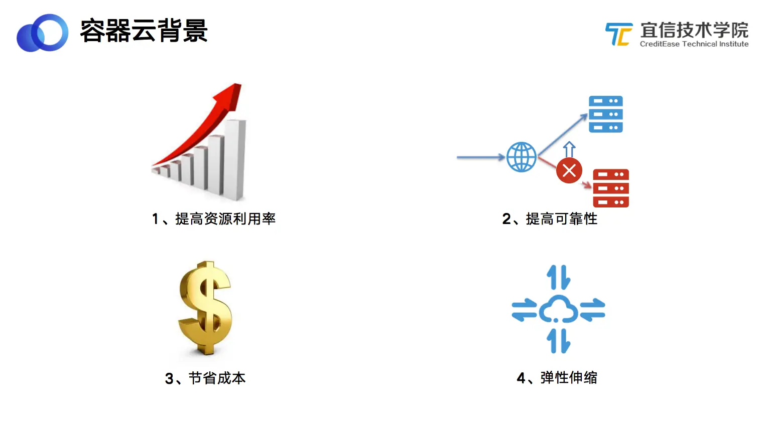 - 节约成本。通过容器云提高了资源利用率,同时也节约了成本。公司每年会采购一些商业化软件,如虚拟化软件、商业存储等,费用动辄千万。我们基于开源技术自研一套容器解决方案,每年为公司节省上千万的软件采购和维保费用。