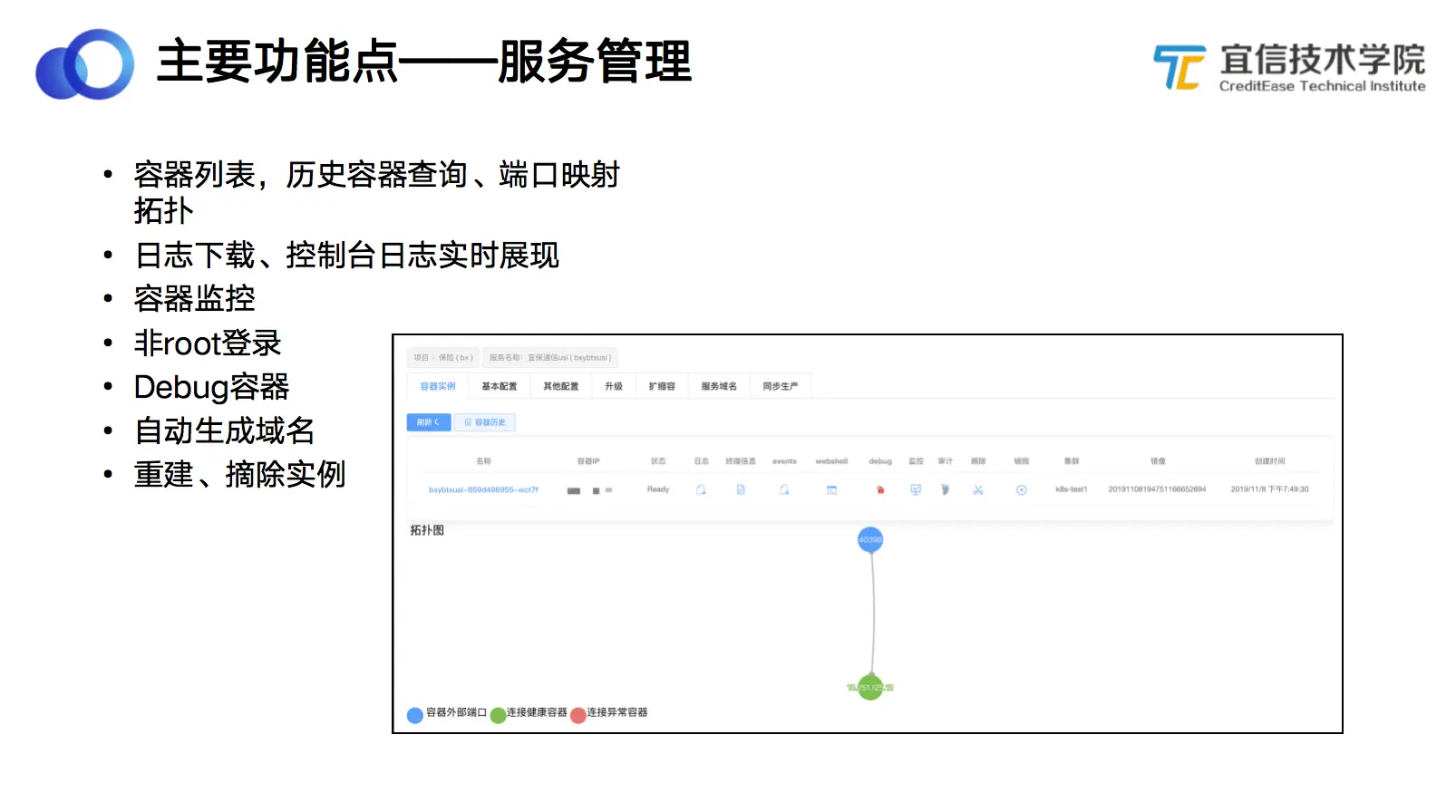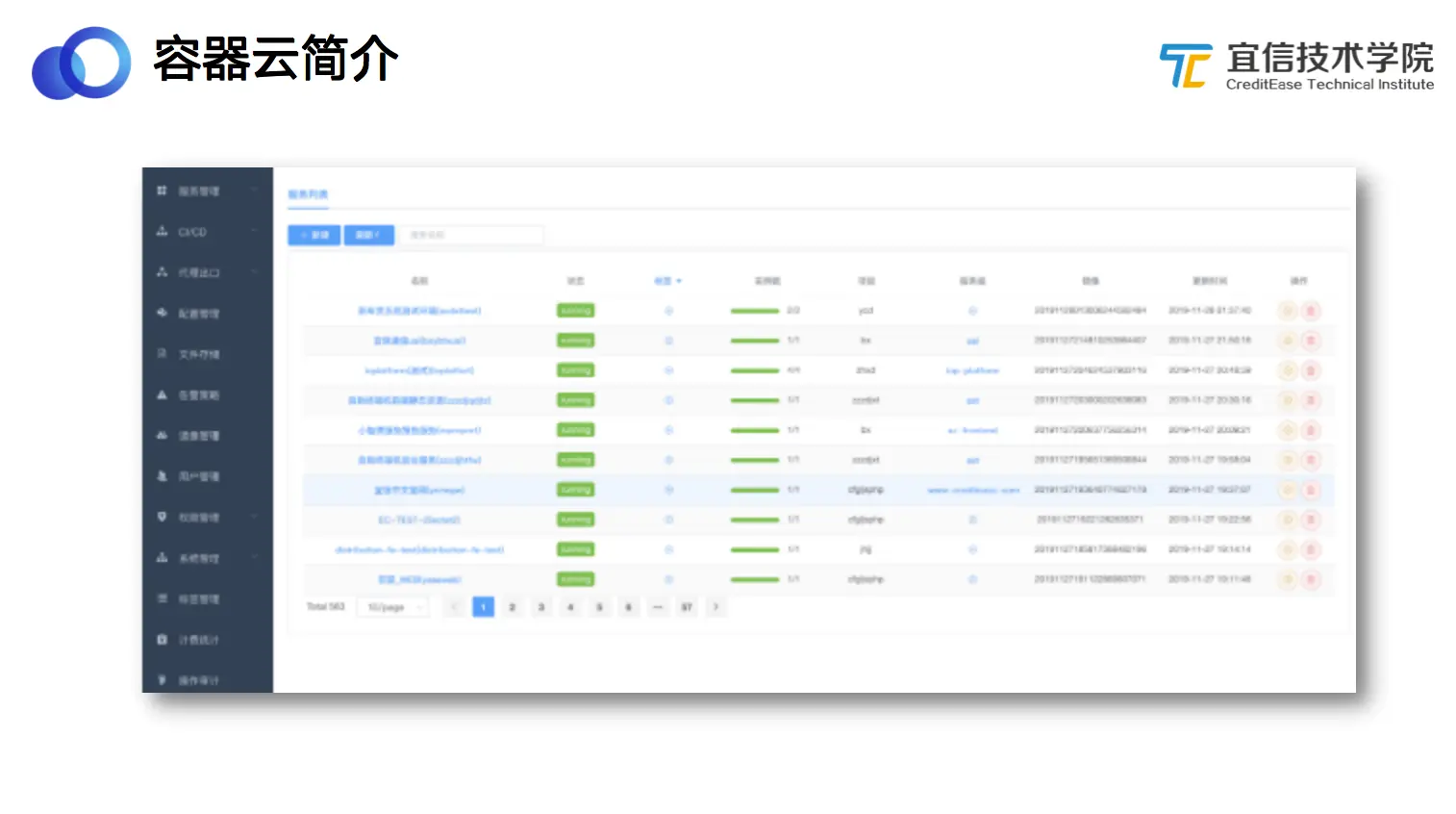 上图左侧是宜信容器云平台的主要功能,包括:服务管理、CI/CD、代理出口、配置管理、文件存储、告警策略、镜像管理、用户管理、权限管理、系统管理等。 右侧是一个服务管理的界面,从中可以看到服务列表、服务名称、服务状态及当前服务数量,还有当前镜像版本及更新时间。