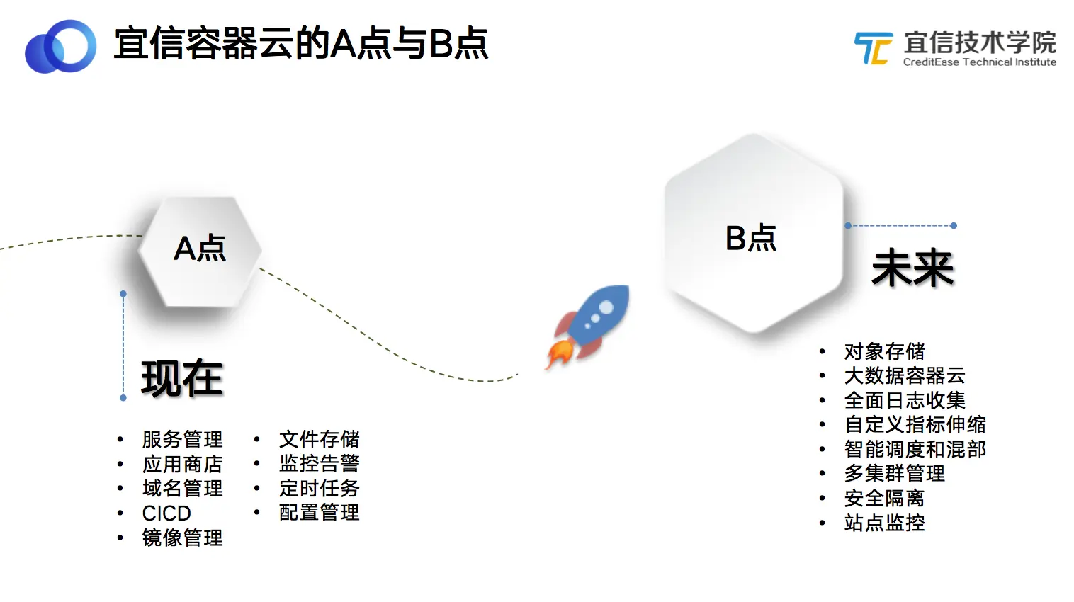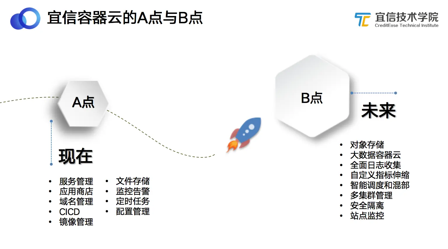 前文介绍了宜信容器云平台目前取得的一些小成就,即宜信容器云平台的A点,接下来介绍宜信容器云的B点,即未来的一些规划。