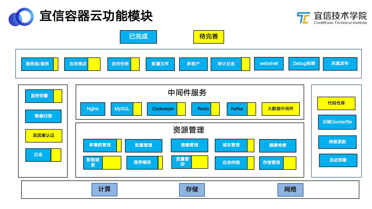 上图为宜信容器云平台的整体功能图,其中蓝色代表已经完成的功能、黄色代表需要优化和改善的功能。