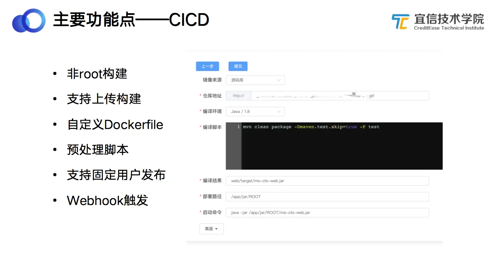 - Codeflow,负责代码构建。通过对接Jenkins实现代码编译、打包镜像以及服务的滚动升级等工作。