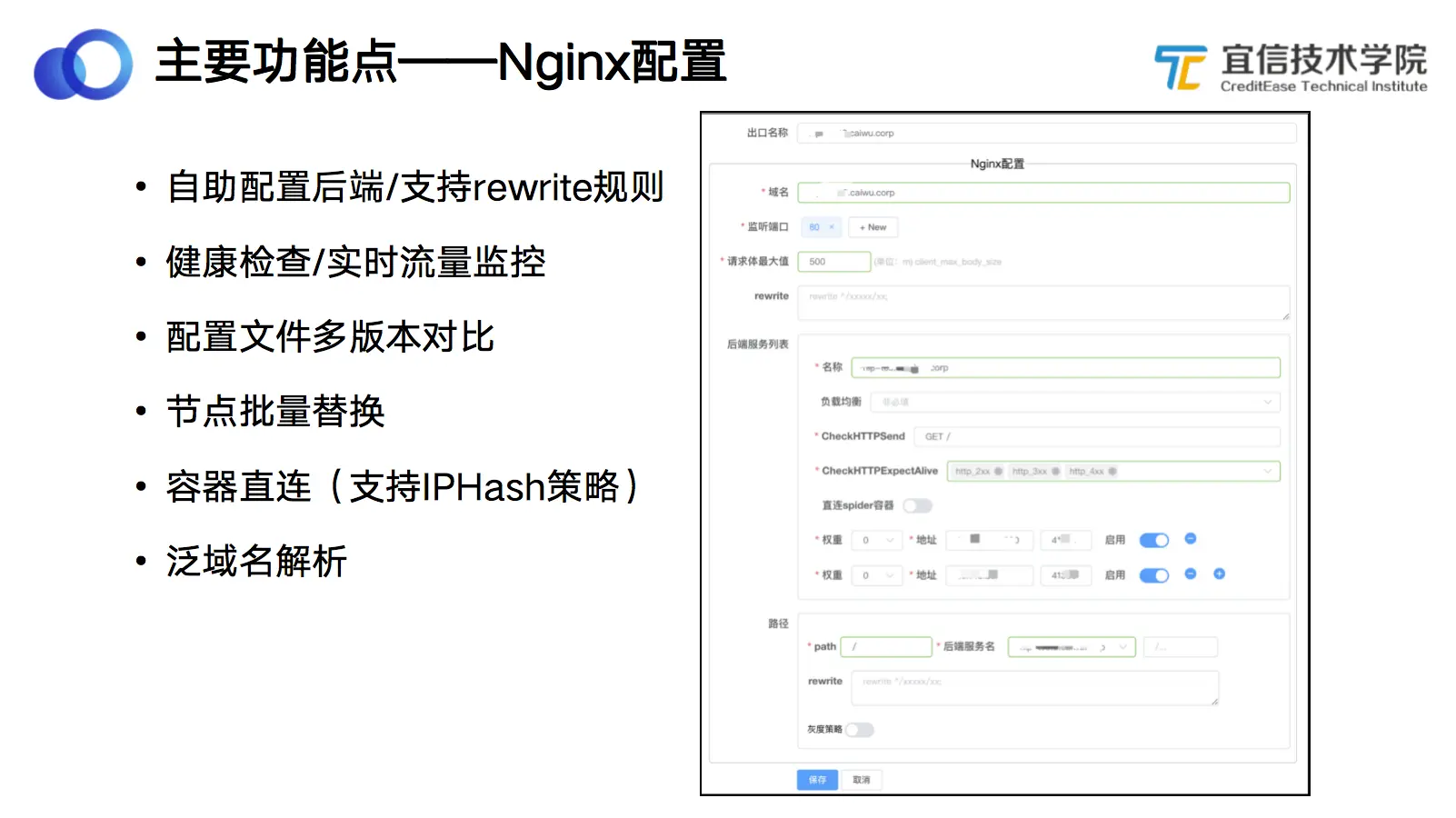公司有大概100多个Nginx集群,之前这些Nginx集群都是通过运维人员手动方式变更配置和维护,配置文件格式不统一,且容易配置错误,问题和故障定位都很困难。为此我们在容器云集成了Nginx配置管理,通过模板的方式生产Nginx配置。Nginx配置的功能比较多,包括健康检查规则、灰度发布策略等相关配置。