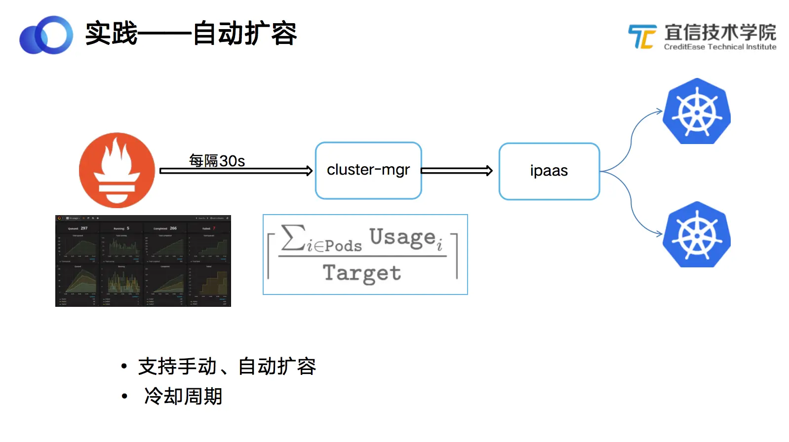 自动扩容,主要是针对业务指标的一些突发流量可以做业务的自动伸缩。其原理非常简单:因为我们所有的性能指标都是通过Prometheus统一采集,而Cluster-mgr负责多集群管理,它会定时(默认30s)去Prometheus获取容器的各种性能指标,通过上图的公式计算出每个服务的最佳副本个数。公式很简单:就是每个容器的性能指标求和,除以用户定义目标指标值,所得结果即为最佳副本数。然后Cluster-mgr会调用Ipaas操作多个集群扩容和缩容副本数。