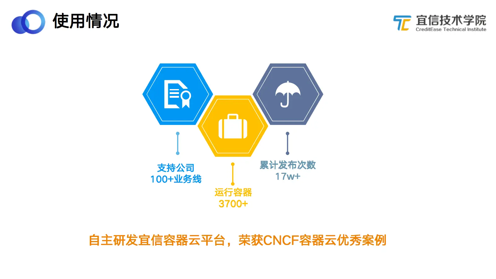 经过几年的推广,目前宜信容器云平台上已经支持了100多条业务线,运行了3700个容器,累计发布17万次,还荣获了“CNCF容器云优秀案例”。