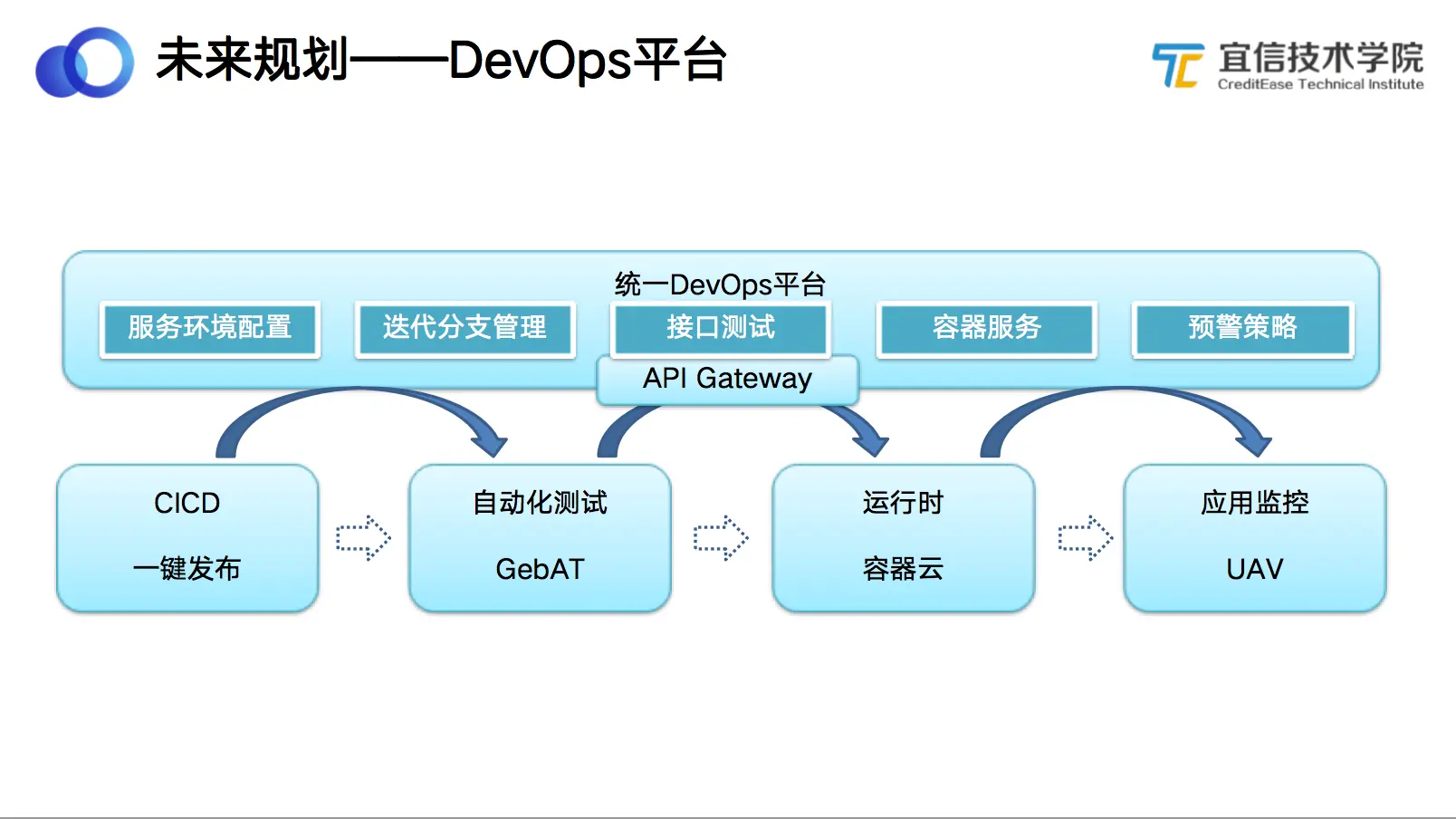 其实这些功能我们基础研发部门都有所涉及,包括自动化测试平台 Gebat、应用监控UAVStack、容器云平台等,但是业务需要登录到不同的平台,关联不同的数据,而各个平台之间的数据不一致、服务名称不对应,没办法直接互通,操作起来非常麻烦。 我们希望通过建立一个统一的DevOps平台,把代码发布、自动化测试、容器运行和监控放到同一个平台上去,让用户可以在一个平台完成所有操作。