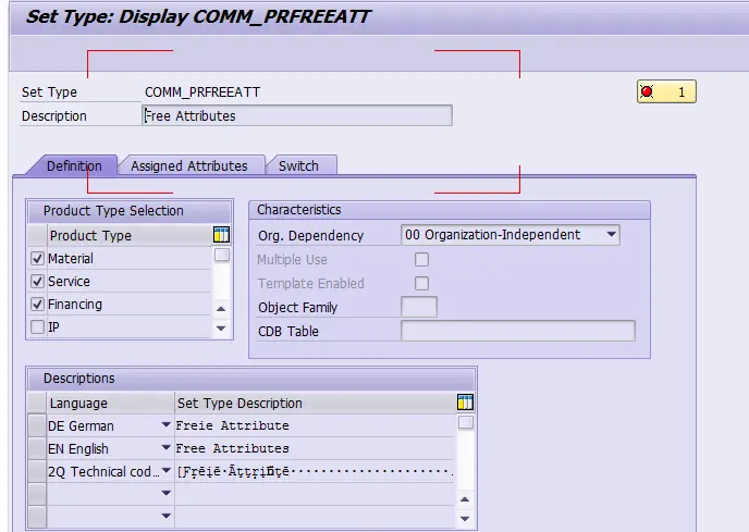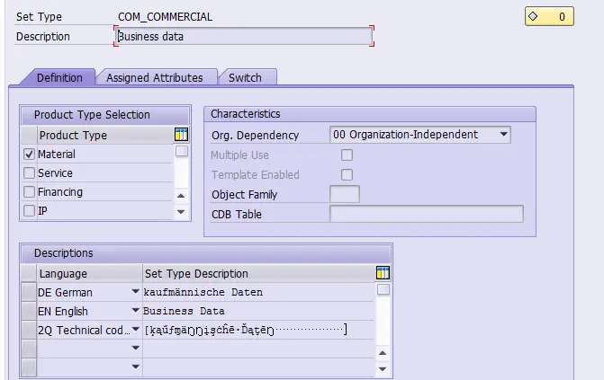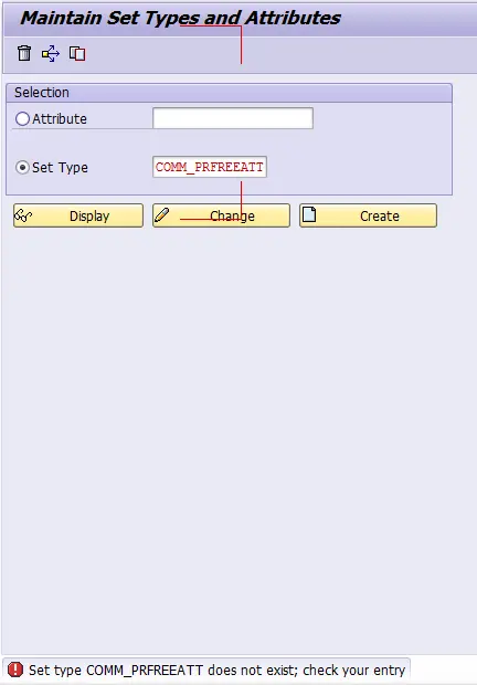 The set type was not created using the Maintain Set Types and Attributes transaction in the product master (COMM_ATTRSET), or it is a standard SAP set type that was created manually (not generated). Make your changes using the transaction originally used to create the set type. Standard SAP set types that were created manually cannot be displayed using a set type transaction as the COMC_SETTYP_ATTR entries required to do this do not exist. The following settypes cannot be displayed in transaction COMM_ATTRSET. The following settype haven't been created by the generation tool of transaction COMM_ATTRSET but they are manually created. At that time the generation tool development was under way. This settypes have no entry in COMC_SETTYP_ATTR. So we don't allow to display them in COMM_ATTRSET: COMM_PR_CONFIG, CRMM_PR_REFOBJ, COMM_PR_MAT, CRMM_PR_TAX, CRMM_PR_SALESG, CRMM_PR_SALESA, COMM_PR_SRV, COMM_PR_UNIT, COMM_PR_SHTEXT, COMM_PR_LGTEXT, CRMM_PR_SALESH, CRMM_PR_BTR, CRMM_PR_SRVRR, CRMM_PR_SRVDUR, COMM_PR_GTIN, CRM_CAT_SAL, CRM_CAT_PUR, COMM_PR_COND, COMM_PROD_VAR, COMM_PR_CM, COMM_PR_STATUS.