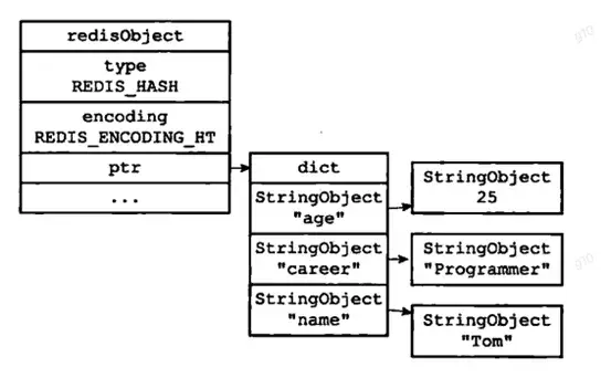 hashTable大家很熟悉,和java里的hashMap很像,都是数组+链表的方式。java里hashmap为了减少hash冲突,设置了负载因子为0.75。同样,redis的hash也有类似的扩容负载因子。细节不提,只需要留个印象,用hashTable编码的话,则会花费至少大于存储的数据25%的空间才能存下这些数据。它大概长这样: