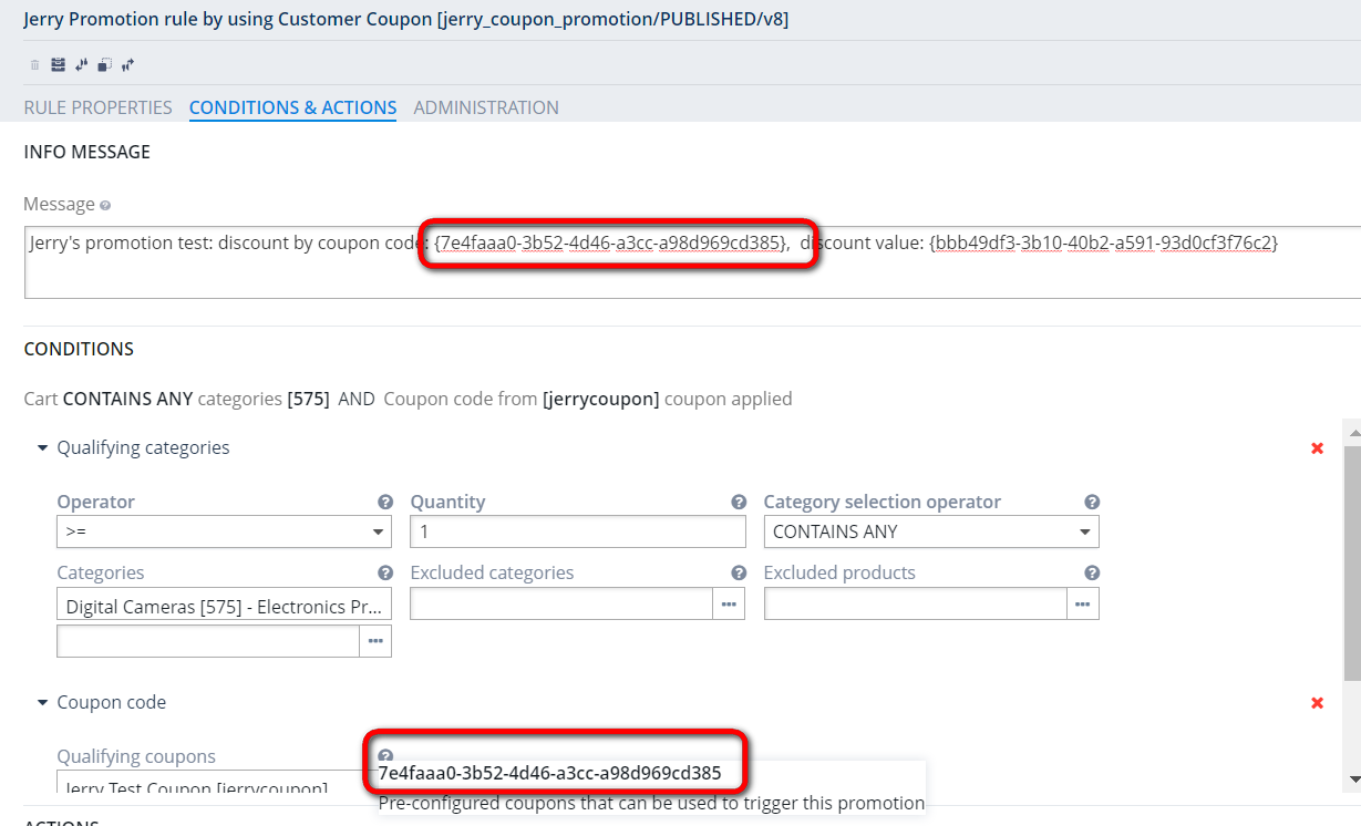 我们点击Promotion rule里任何一个变量的小问号,都能得到一个guid,把这个guid插入大括号,在运行时就能给客户显示变量实际的值,作为提示信息: