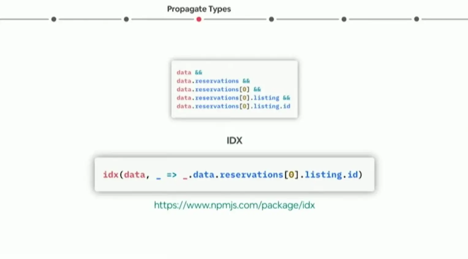 使用TS Type文件,一个问题就是Null的检查,如上图部分所示,往往需要一层层对对象里面的内容进行判空处理,我们通过采用一个IDX的npm库来解决这个问题。当然optional channing已经是JavaScript TC39的提案,并且已经在TypeScript 3.7版本中得到支持。