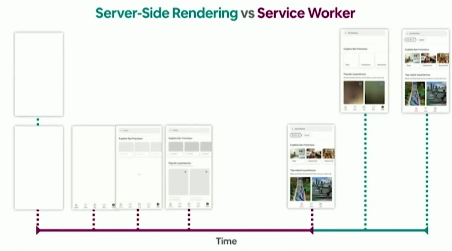 这张图对比了采用服务端渲染(SSR)和Service Worker的两种方式的体验情况。在图的上半部分是采用SSR,可以看到由于需要等待服务端渲染,所以存在大量的白屏时间,然后直接加载整个内容。而采用Service Worker,用户可以一开始就看到应用的骨架布局,而且由于大量静态资源已经是本地缓存,因此页面渲染也非常迅速。
