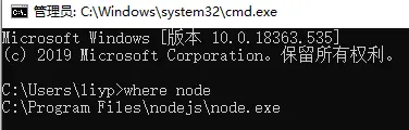 2.在命令行输入where node,查看原来电脑上node的位置(卸载重装也可)