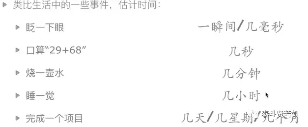 这里你会发现我们会用“几”表示一个大概,后面还有相应的时间单位,那时间复杂度也参照类似的方法: