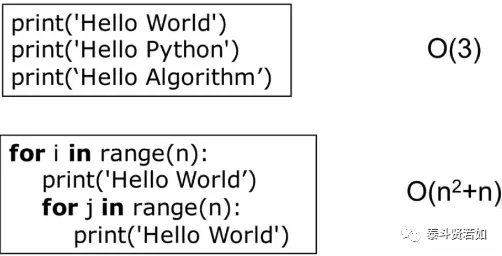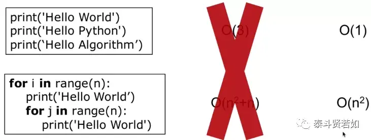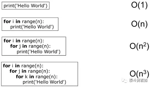 第一个为什么是O(1),首先print('Hello World')打印一次和打印三次实际的影响不大吧,就是不管执行几次,只要它的规模不上升到n这么大的时候,换句话说,1是个单位,所以不管怎样,因为这是表示近似,不是表示精确的,所以是O(1).好,再看下面这个图片: