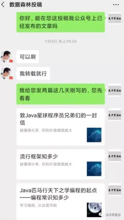 我当时认定今后我公众号针对的人群是学计算机专业的大学生和一些自学编程的人士,这跟我目前的身份有关,我要做我能力范围之内的事。我自始至终都认为,不管做什么事,真诚是基础,付出是提升。这时候我的福星秋哥出场了,他帮我在他的公众号【苦逼的码农】和朋友圈中推广了一下,哇,仅仅一天时间就有近两百人关注,没过两天,我的公众号上就有三百多人关注了。不贪不骄,知足常乐,我觉得我现在做的不应该仅仅是如何吸粉,还要考虑如何留粉,把已经关注我的这些朋友给留住。因为当时秋哥推荐我的时候明显说了我公众号里面内容的方向,所以关注的人都是奔着我的方向来的,我照旧按我提前设定的方向发布文章,哈哈,已经关注的朋友很少有人取消关注,我成功的留住了他们。后来还是秋哥,给我指了一条路,他说让我跟别的一些大号投稿,这样也能引流,于是我把我关注的好多个公众大号光顾了一遍,看着差不多对口的我都加了那些号主好友,然后从公众号精挑细选了几篇文章给那些号主发过去,问他们是否可以转发。嘿嘿,不好意思,都被婉拒了,要么是对方挑我文章毛病,要么说是说文章内容跟他们的公众号方向不对口。不过老天还是公平的,虽然投稿的时候给我关闭了一扇门,却也为我打开了一扇窗户,当我向一位叫【数据森麟】的号主投稿的时候,虽然也被他婉拒了,但是剧情反转的一幕是,他给我推荐了一个投稿群,并把我拉了进去,当时我特别感动,因为在那前一天,我刚经历过一场有惊无险的车祸,差点命都丢了,还好捡了一条命,为了纪念重生,我写了一篇文章《天降大祸于斯人也——幸捡一命,深思我的程序员生涯》,然后这位善良的号主对我的善举,让我感受到了人间自有真情在,我相信好人终有好报,时间会证明一切的。有了这个投稿群,我将我投稿的文章写上推荐理由,然后发到投稿群里,天可怜见,还是有一些号主能欣赏我,主动@我跟我开白,第一天我特别激动,给@我的几个号主都开了长白。后来我果然看到那些号主在他们的公众号上转发了我的文章,看到这些,对当时的我来说,别提有多开心了。