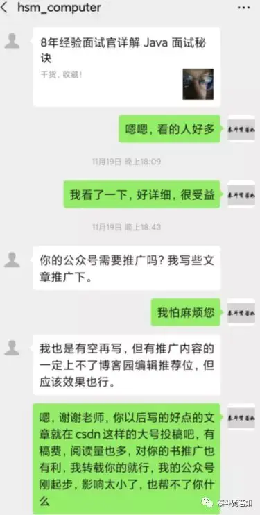 在我投稿的文章中,你会看到有一些是关于面试的,我也不藏私,把这段小插曲说出来。博客园有一位叫hsm_computer的大牛,可能很多朋友一看到这个名字就知道他是谁,因为他的文章经常会出现在博客园编辑推荐和各种推荐的排名榜上,关注他的粉丝也很多。就是这样一位大牛,他会时不时的在我发布的博客下面评论一些鼓励我的话,甚至在我第三个月写博客的时候关注了我,我不知道为什么会吸引他关注我,不过那个不重要,重要的是我很激动,被这样一位大牛关注着,我学习的动力十足,有一种被认同感,这就是对我最好的鼓励了。我以为这就已经够幸运了,没想到幸运女神对我情有独钟,非要再给我附加一份礼物,在我用公众号吸粉的重要时刻,hsm_computer大牛主动关注我的公众号并添加了我微信好友,这还不够,还给我发信息,当时他找我是因为他在CSDN有一节免费直播课,让我帮忙在学校推广一下。同样,我不知道他为什么会选择我,让我帮他,在我看来,以他的影响力,这种小事还没到他亲自出马找人帮忙的时候。不重要,怎么想的不重要,重要的是他已经选择了我,或许我有点自以为是吧,但我觉得能帮他做点什么,我是十分乐意的,还稍带点自豪感,我在当天按照他的吩咐在学校推广了他的免费直播课,虽然不知道给他带去了多少人,但至少我做了我该做的,我能做的。在我看来很小的一件事,却没想到确是给我带来了很大的福报。事后他跟我说,我可以在我公众号上随意发布他博客园里的文章,甚至后面又说,如果我公众号需要文章,他可以给我写。简直是一个晴天霹雳,我这是走的什么运啊。不过接下来的一幕或许会让你大跌眼镜,我拒绝了,天真的我当时想着,我在博客园有自己的文章,我自己也会写,何必用你的文章,我当时立志要全部原创的。后来嘛,恐怕你又要大跌眼镜了,我专门去他的博客园看了他写的文章,哇,发现几乎大多都是跟大学生面试相关的文章,我突发奇想,想着我公众号上也可以加一个关于大学生面试的栏目,我也有这个需求,我可以自己看,也可以服务于别人,好事成双,何乐而不为呢。嘿嘿~~,我又找老师商量,不过我也没那么贪心,我知道老师自己出版过几本书,我说我可以在发布文章的时候顺便帮他推广一下他的书,他的书我看了,他送了我一本,还在书上写上了他的亲笔签名,我拿到书后,我身边的同学也看了,一致好评,因为都是干货,对大学生找工作确实很实用,这不就是我们大学生需要的嘛,帮他推广让更多人受益岂不更美。