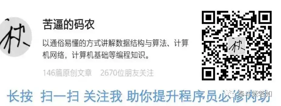 公众号【苦逼的码农】,作者秋哥,他是大四学长,今年刚收到腾讯的Offer,是我的榜样,现在推送他,不仅仅是因为他帮了我,主要是因为他的公众号上的文章对我公众号上针对的人群依旧有用,而且好处可能更多,理由是他比我强,还有一点是,我给他开了长白,我弱弱的跟他说,要是我的文章里有他看上的,能不能在他的公众号上转发一下,他跟我说,他挑选文章很严格,他看中的当然没问题,但是如果他看不上,关系再好都没用,他是不会发的,这句话让我听了挺敬佩的,或许这就是他收获第一个十万,有那么多粉丝的原因吧。他以通俗易懂的方式讲解数据结构和算法、计算机网络、计算机基础等编程知识,我也经常看他的文章,确实获益匪浅,我在这声明我不是在帮他推,他毫不知情,我没跟他说,只是我愿意罢了,我愿意把我认为好的,对很多人有帮助的好文章分享给更多的人,虽然我这公众号上的九百人很少,在他看来九牛一毛而已,但千里送鹅毛,礼轻情意重,感谢秋哥对我的所有帮助。