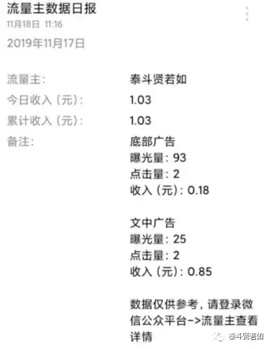 终于满五百了,哈哈,还等什么,开通流量主呗,搞这么多天,早就像尝尝流量主香不香了。所谓流量主无非是在文章中加点广告,还有文章的曝光量,听说读者点广告就会产生钱,天真够傻的我,在开通流量主的第一天,被金钱的欲望所吞噬,居然狂点我公众号中的广告,点了好多个,结果第二天没一分钱不说,腾讯还把我的广告给屏蔽了(后来百度知道的),直到现在,我的公众号上都看不见一个广告,唉,之前已经吐过一次血了,写的时候还想吐,所以朋友们啊,第一,你们要是想某个号主加鸡腿,一定要有节制的点广告啊,第二,号主朋友们,以我为诫,控制贪欲啊。呜呜~~血淋淋的教训,我试过了,你们就别再入坑了。