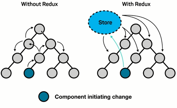 右边是使用了redux的组件传值。在redux中所有组件的数据都放在store中,在组件中少放或者不放数据。这个时候深蓝色组件与其他通信,只需改变store里面的数据,其他组件会自己感知store发生变化,自动去取store里面的数据,这样蓝色组件就非常轻松的将数据传递到其他组件。