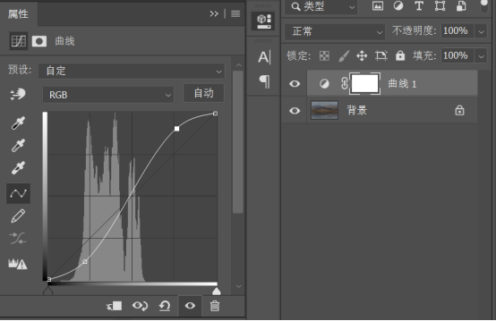 在ps中,增加对比可以用曲线、色阶、ACR等。首先打开曲线调整层,做出如下曲线形态,即可加强明暗对比。
