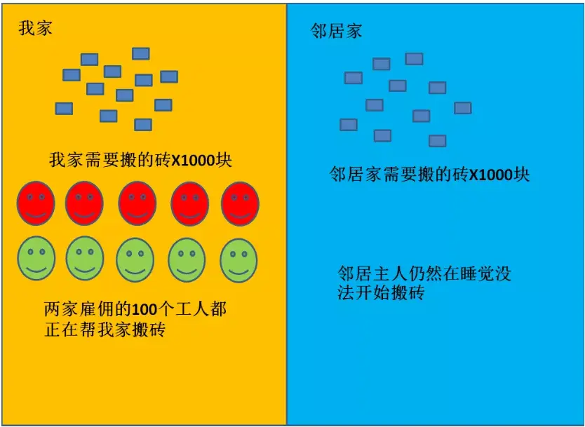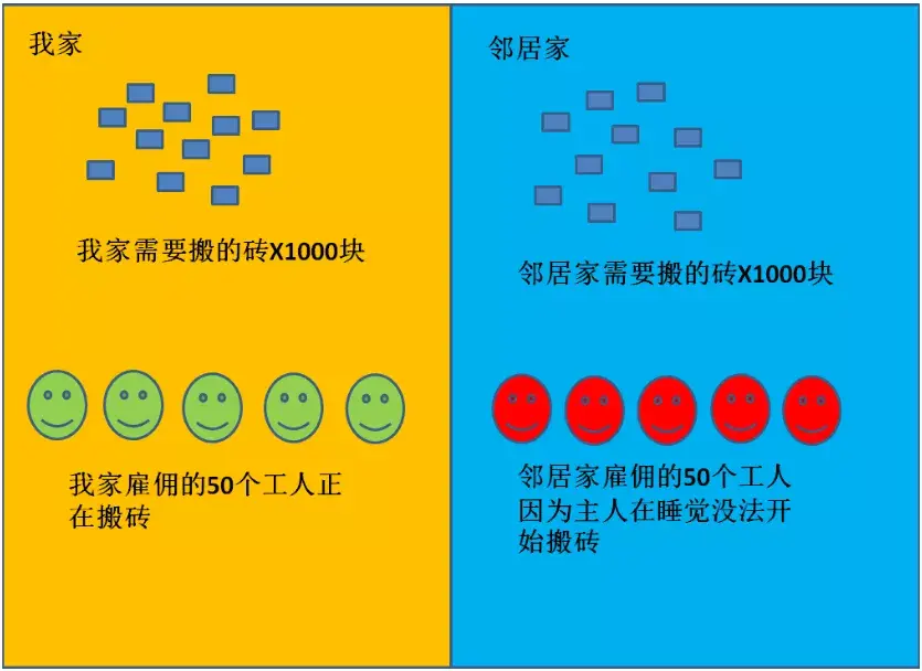把物理机变成虚拟机的这个技术,就是“虚拟化”。比如我家里装修有100块砖需要搬运,邻居家也在装修同样有100块砖需要搬运,我们各请了50个搬运工,当工人到达时发现邻居家的主人在睡觉,因此他家的50个工人只能等他睡醒再搬砖,我家请的50个工人则可以直接帮我开始搬砖,情况如下图所示: