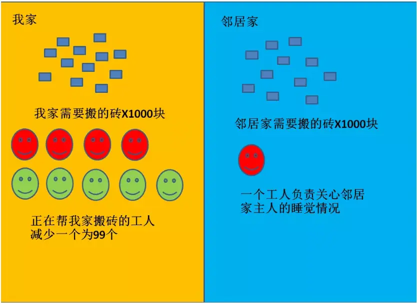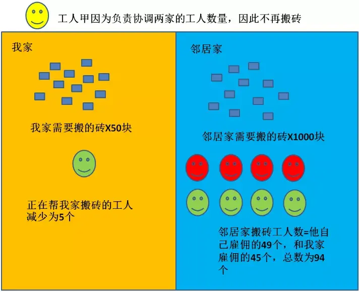 隐患在于如果我家砖搬完了,邻居家的搬砖工人上升到99个,他发现需要再快一点,要求100个工人搬砖,这时候我和邻居将同时发现劳动力因为有人去做管理工作而少了一个,我们两家总共花了100个工人的钱,却总共只能享受到99个工人的劳动力。