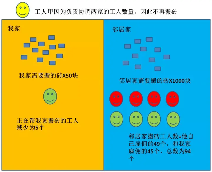 从以上搬砖的例子中可以发现,因为工人甲负责协调我和邻居家搬砖的工人安排因此他本身不再负责搬砖,也就是100个劳动力中抽调了1个工人的劳动力来做管理工作,实际搬砖的劳动力为99个。按照原来雇佣的劳动力,我家雇佣了50个工人,邻居家雇佣了50个工人,总的劳动力为100人,因此实际搬砖的劳动力少了1个,但因为我和邻居家搬砖时间的错开并且以我们的感受都享受到了远大于50个工人的劳动力(实际我家99个,邻居醒来后他家为94个)因此满足我们的需求,也就并不太在意100个工人中有1个来作为协调我们两家工人数的管理人员。
