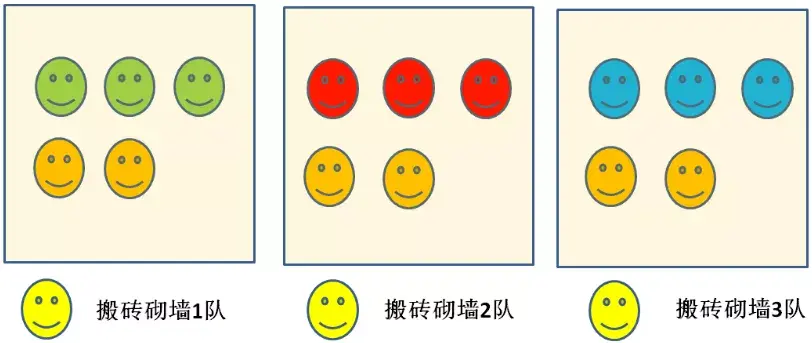 回到搬砖的例子,包工头又碰到了新问题,邻居他自己就是一个项目经理,对于搬砖和砌墙有特殊的要求,他要求一个搬砖砌墙队内的100个工人上午搬左边的砖,同时砌右边的墙;下午搬右边的砖,同时砌左边的墙。而目前搬砖砌墙队的项目经理没经历过这种情况,不知道该怎么调配队伍内的工人。