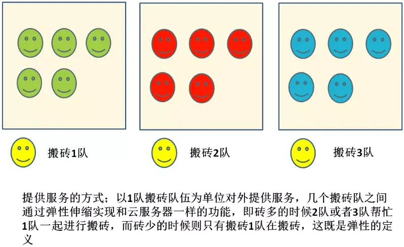 需要重点指出的是,搬砖队伍弹性伸缩的最小单位是1个队伍,如果搬砖1队忙不过来,只能要求整个搬砖2队或者搬砖3队整个队伍过来帮忙,而不能说从搬砖2队仅抽取几个工人过来帮忙。通过这种结构确保了每队搬砖队伍的劳动力因为有专门的项目经理进行管理而不会有损耗。这里先不引伸到神龙架构,因为还有一个重要的问题没有提到。