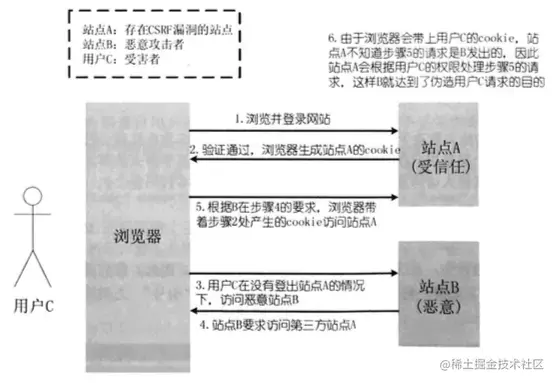 - 在不登出站点A(清除站点A的cookie)的情况下,访问恶意站点B,攻击者就能够完成CSRF攻击。