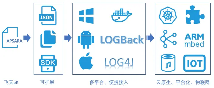 SLS 第一版本支持一类数据源-- 飞天格式的日志文件,在五年中逐步扩展到各语言SDK,移动端,嵌入式芯片,物联网和云原生等环境: