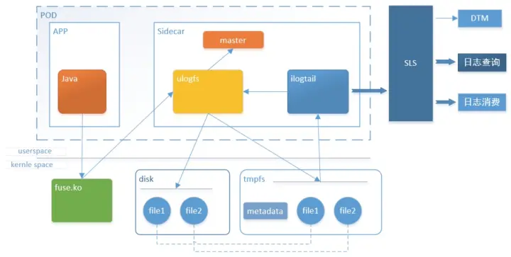 因此我们和蚂蚁系统部合作开展了日志无盘化项目,基于用户态文件系统,为应用虚拟出一个日志盘,而日志盘的背后直接通过用户态文件系统对接Logtail并直传到SLS,以最快的方式实现日志可看、可查。