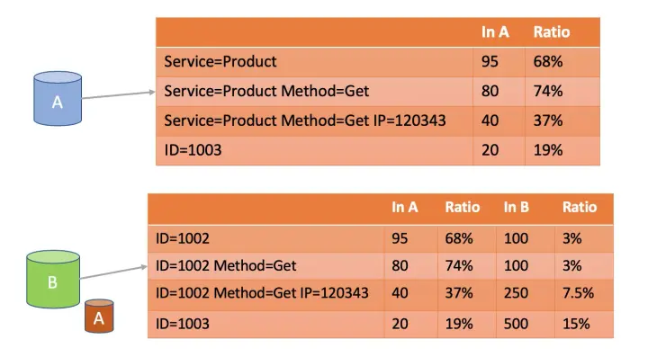 如样例中,将出现错误(status >= 500)的访问数据集,定义为异常集合A,在这个集合发现90%的请求,都是由ID=1002引起,所以值得怀疑,当前的错误和ID=1002有关,同时为了减少误判,再从正常的数据集合B(status <500)中,查看ID=1002的比例,发现在集合B中的该ID比例较低,所以更加强系统判断,当前异常和这个ID=1002有非常高的相关性。
