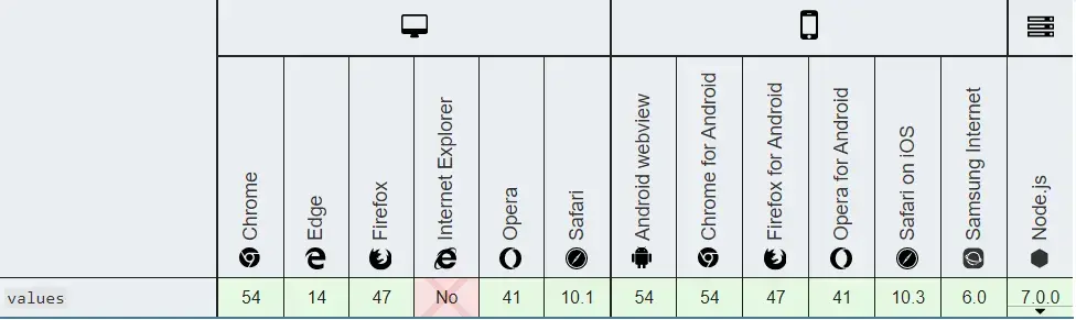 Object.values()与Object.entries()兼容性一致,下面以Object.values()为例:
