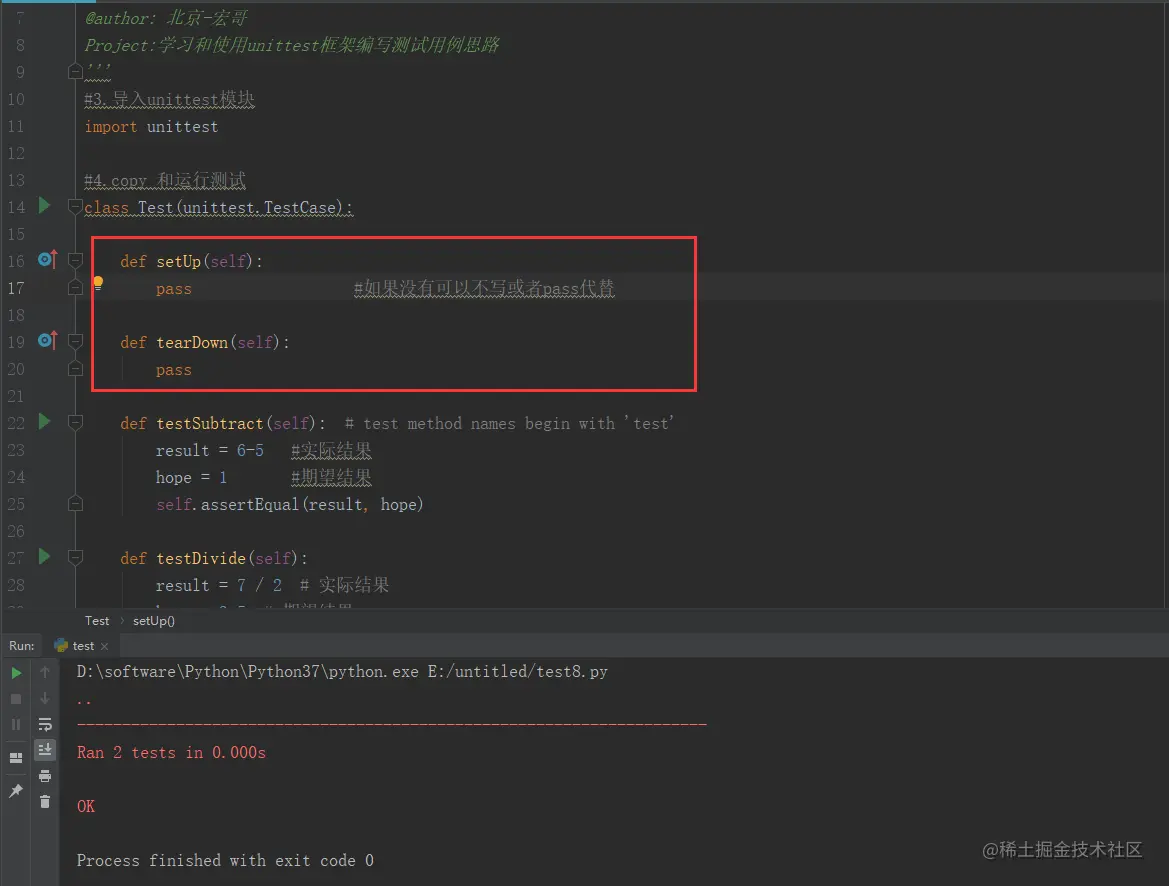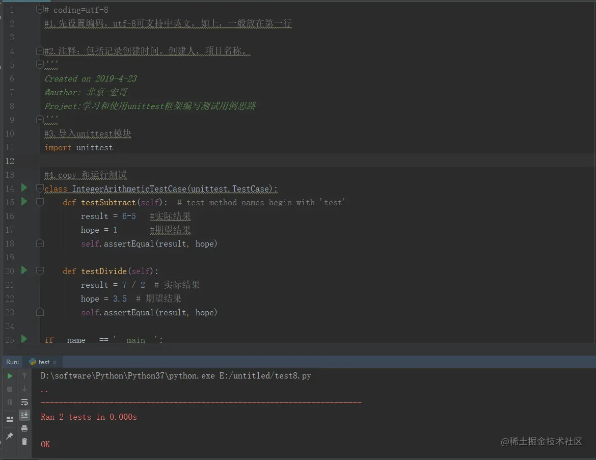 5、if 下面的这个 unittest.main()是运行主函数,运行后会看到测试结果(跑了两个用例耗时 0.000 秒,两个用例都通过)