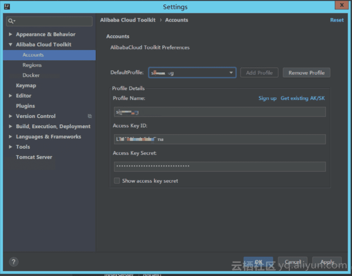 安装完插件之后,点击:顶部菜单Tools --> Alibaba Cloud Toolkit --> Preferences-->左边列表的 Alibaba Cloud Toolkit--> Accounts ,出现如下界面,配置阿里云账号的 AK 和 SK,即可完成首选项配置。(如果是子账号,则填写子账号的 AK 和 SK)