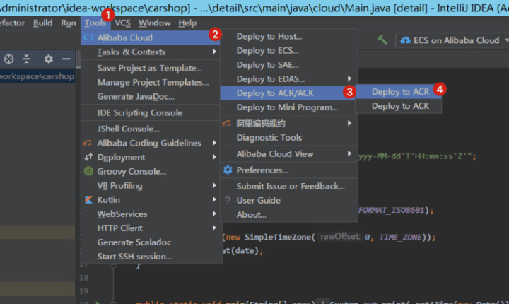 第一步:在 Intellij IDEA 中,如下图点击:顶部菜单Tools --> Alibaba Cloud -->Deploy to ACR/ACK --> Deploy to ACR。