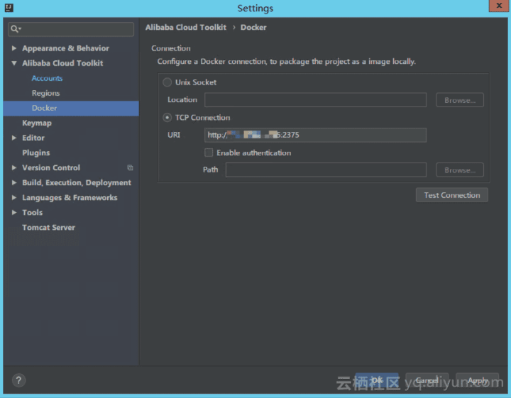 点击:顶部菜单Tools --> Alibaba Cloud Toolkit --> Preferences --> 左边列表的 Alibaba Cloud Toolkit --> Docker,如下图,设置本地 Docker 镜像打包。