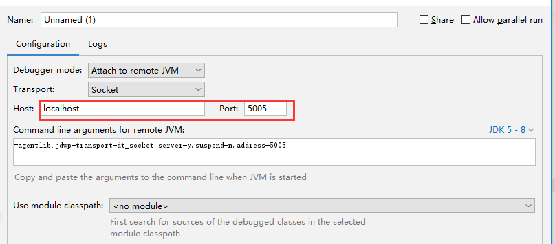 配置地址和端口 端口需要服务器中没有被占用的端口,一旦正确配置了服务器的地址和端口,Command line arguments for remote JVM中自动生成的服务器JVM配置就是正确的了,复制好里面的内容,然后保存刚才的配置