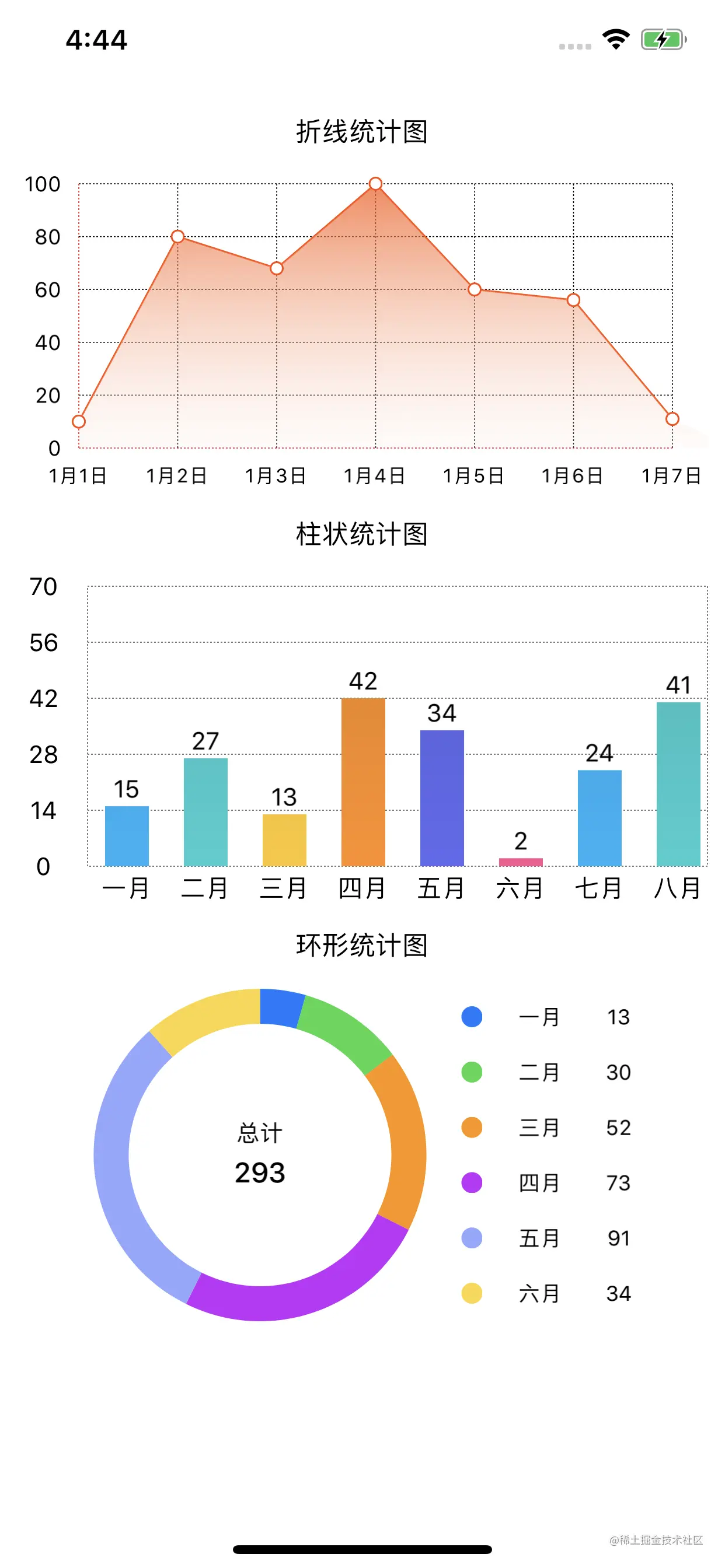 设置完上面的,一个高颜值原生折线统计图就可以使用了。 如果好用就请点赞关注,会不定期更新更多干货。更多源码可以去GitHub下载。
