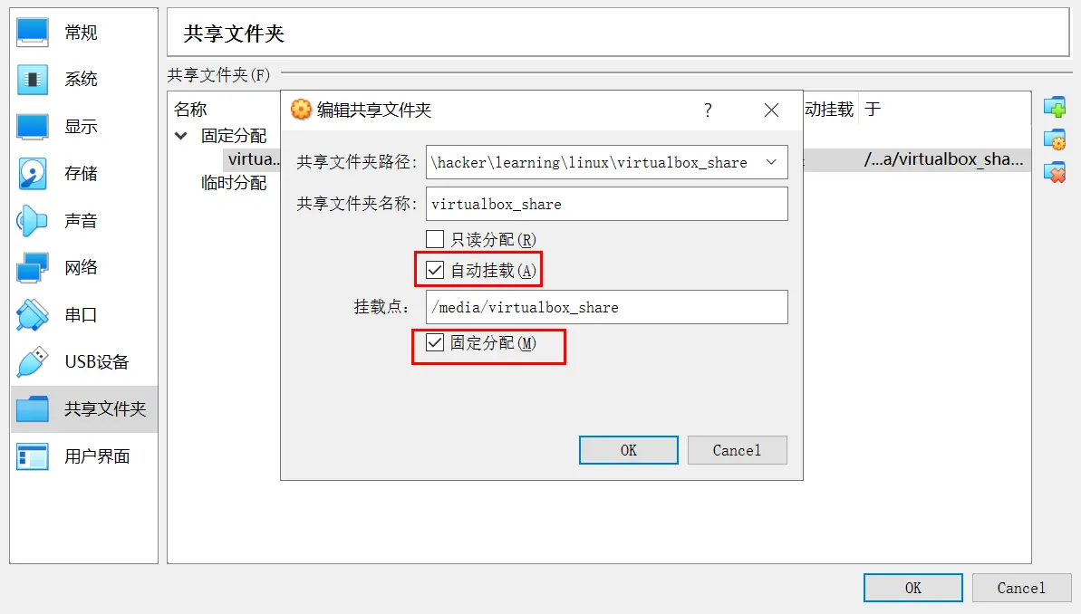 virtual box->设备->共享文件夹->共享文件夹.....->➕->自动挂载->固定分配 -
