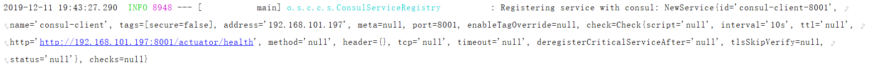 至此,我们服务注册功能雏形就已经基本完成了,启动项目,出现下面的日志,同时打开(http://localhhost:8500)能查看到我们的服务