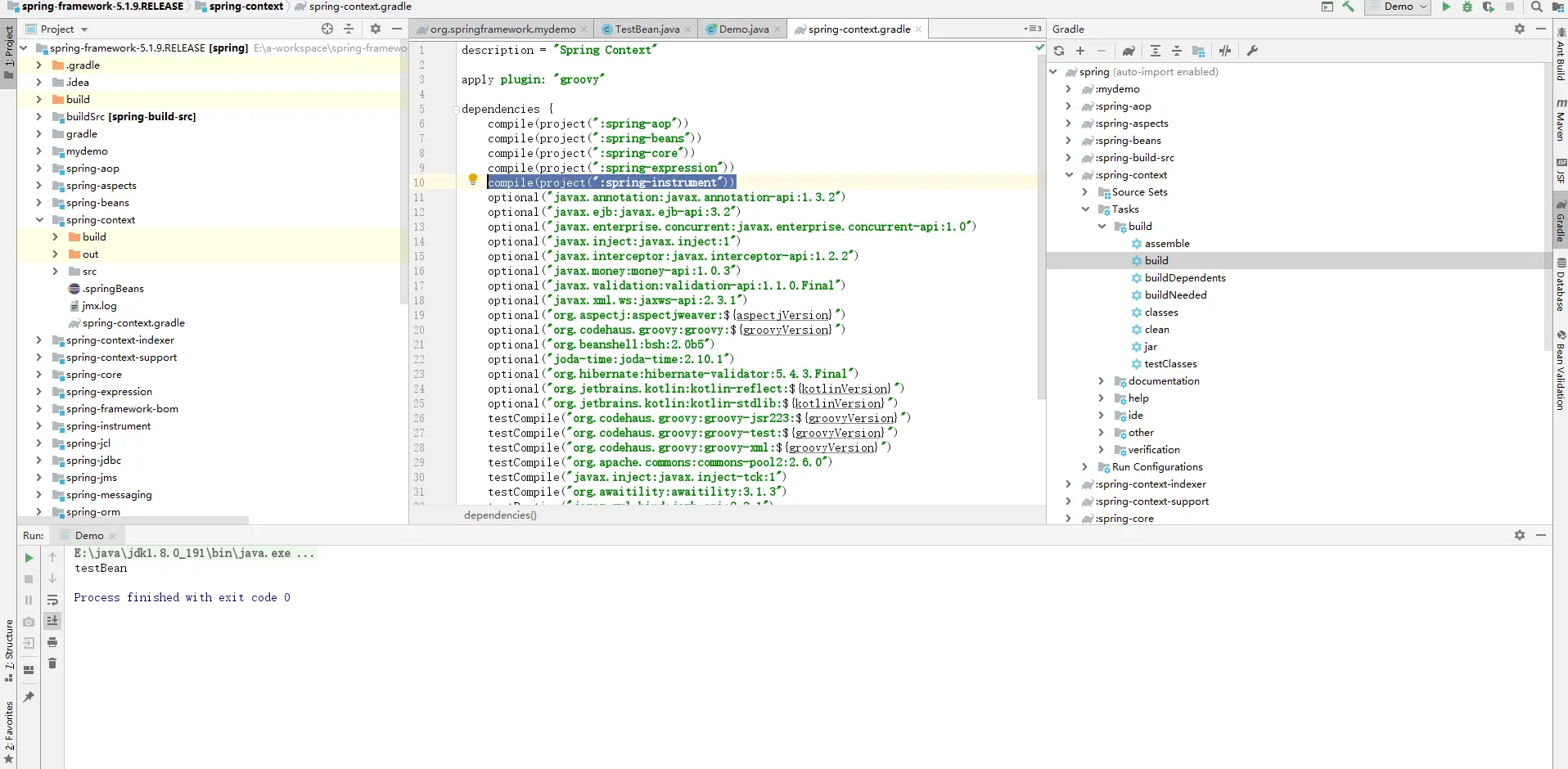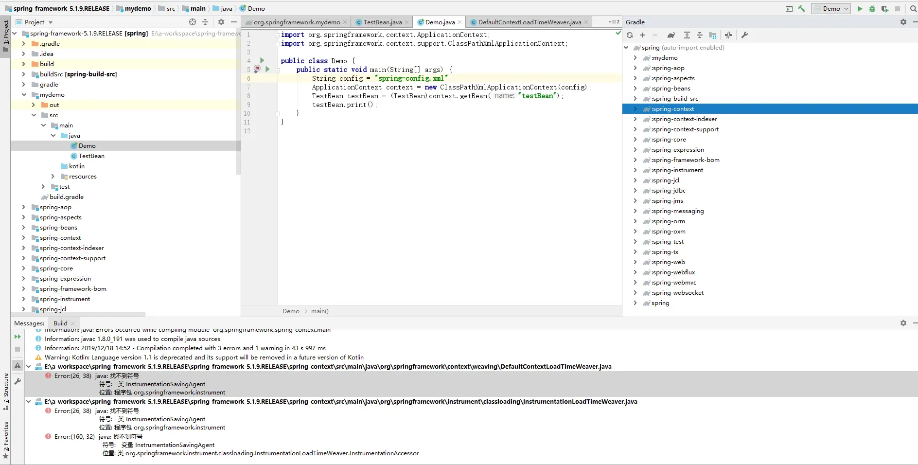 建立自己的模块mydemo,不要污染spring的源代码,运行时会报错类找不到,这个类不存在现有模块源代码里面,需要修改spring-context.gardle