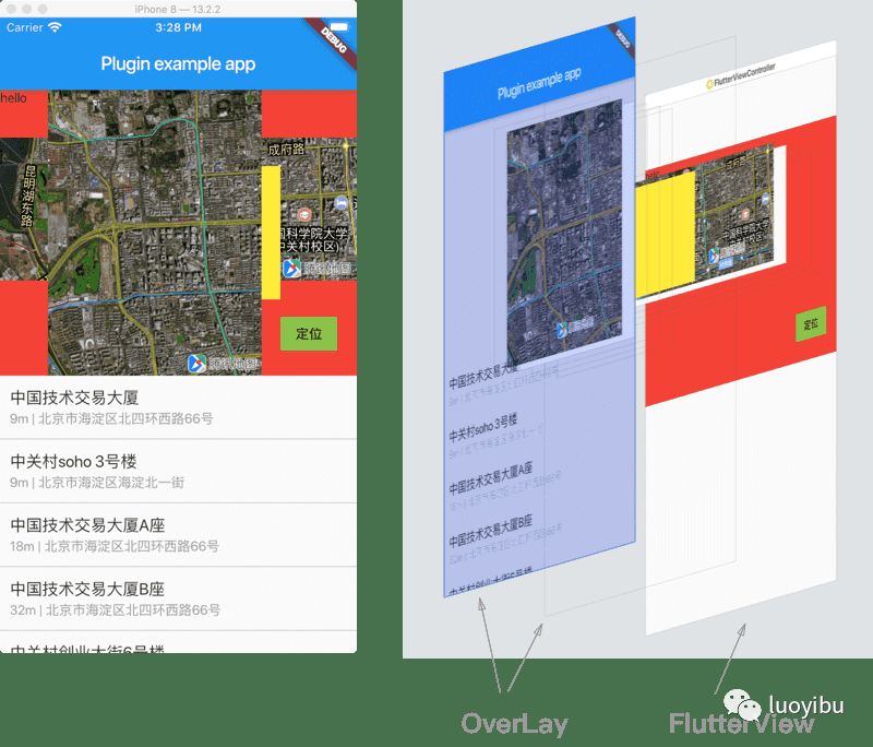 对应右边的UI层级结构图,我们可以看到Stack最底层的Red container,被绘制到FlutterView上了,其会被其他的mapview遮挡。