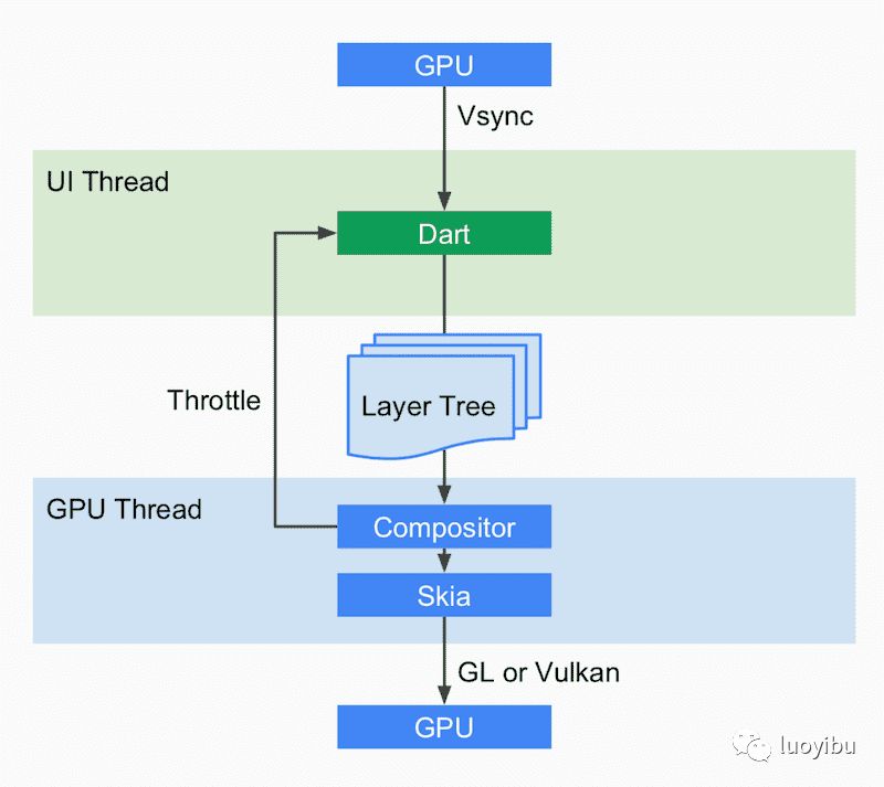 真正的渲染工作是在engine层处理的,其接受dart层传递的layerTree,然后通过GPU渲染出来。注意这里layerTree和RenderObject还有区别,并不是每一个renderObject节点都有对应的layer节点。