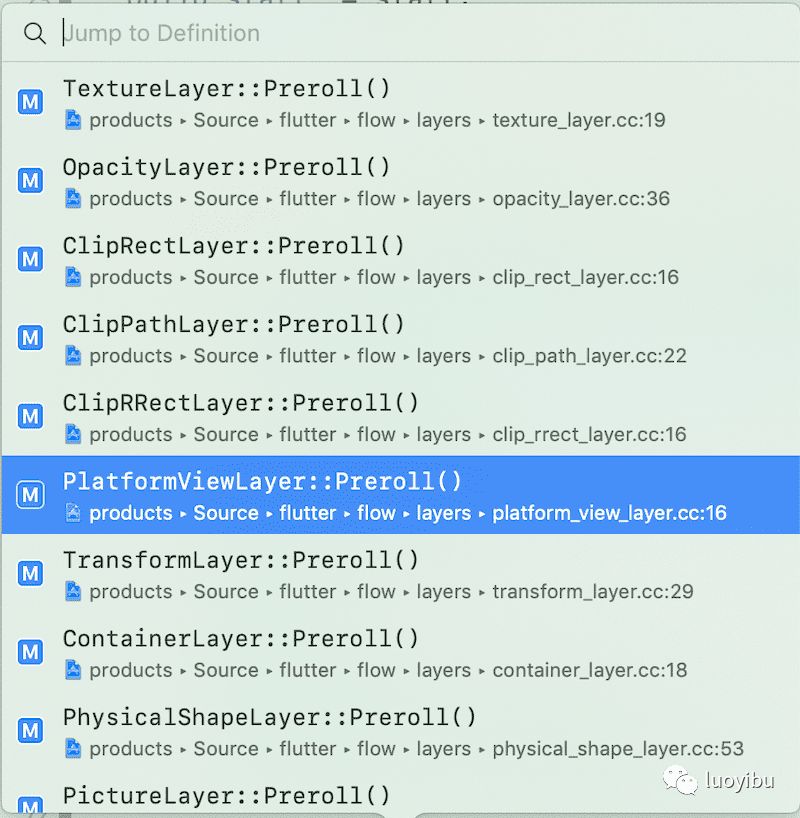 通过xcode的代码跳转提示,可以看到layerTree的叶子节点多种多样,那么和我们platform view相关的就是PlatformViewLayer了。当遍历到这种layer的时候,flutter就知道这里需要渲染一个native view了。