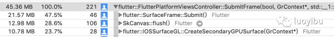 从上图可以看到45M内存全是由FlutterPlatformViewsController::SubmitFrame创建的,在原理篇我们介绍过,这个 FlutterPlatformViewsController正是处理PlatformViewLayer绘制用的。