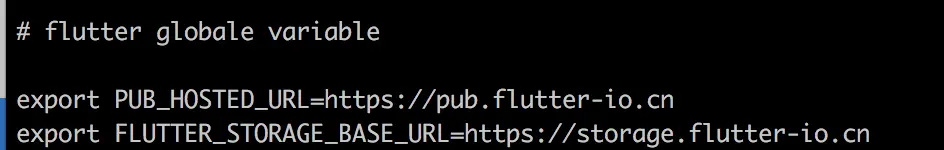 export PUB_HOSTED_URL=https://pub.flutter-io.cn export FLUTTER_STORAGE_BASE_URL=https://storage.flutter-io.cn