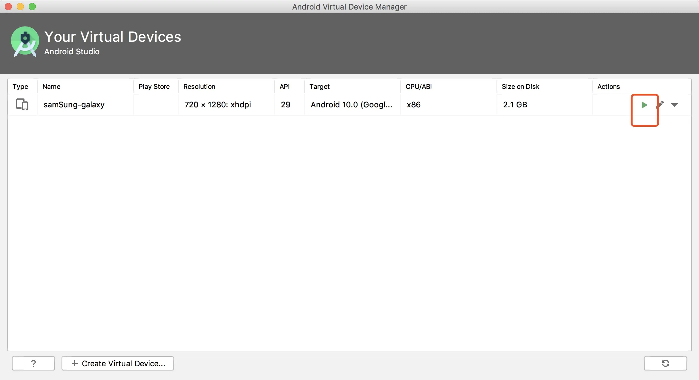 完成以上步骤后,环境基本上已经处理好了。通常调试应用,我们可以通过链接设备或者使用 Android 模拟器。 体验上讲,模拟器会更好一些,我们可以测试不同的设备型号。