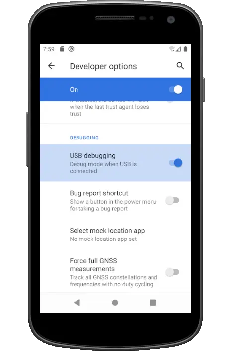 下载好模拟器之后,点击运行,打开模拟器之后, 先开启开发者选项,再开启USB debugging,步骤如下。完成后,模拟器调试就结束了。