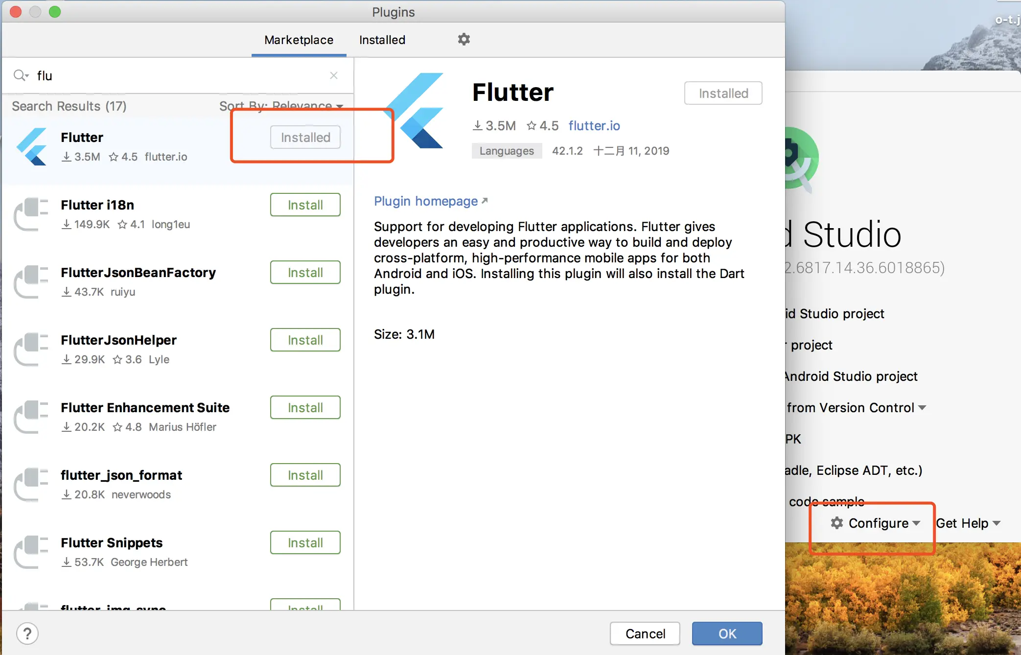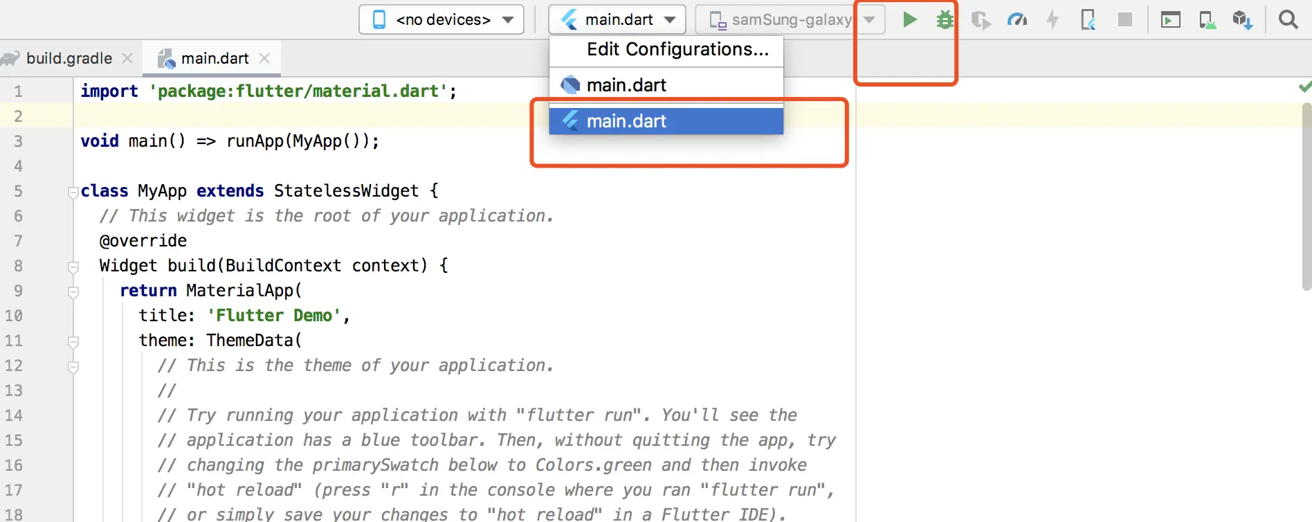 可在 AS Plugin 中,搜索 FLutter , 安装并重启。安装成功后,安装 Flutter 官方步骤新建一个工程,在 IDE 上方选中入口文件并运行。